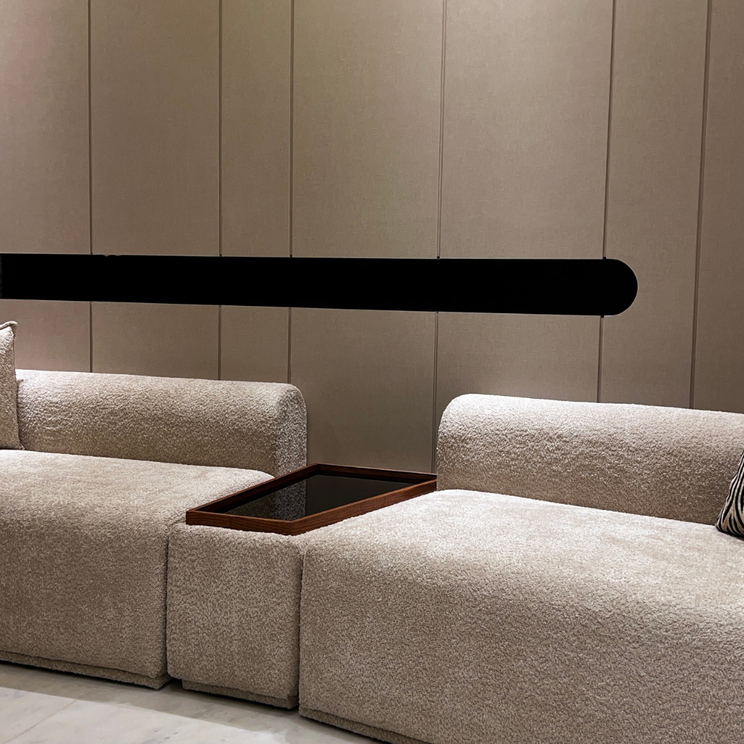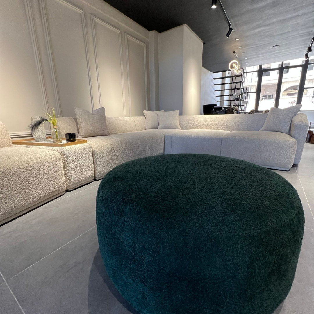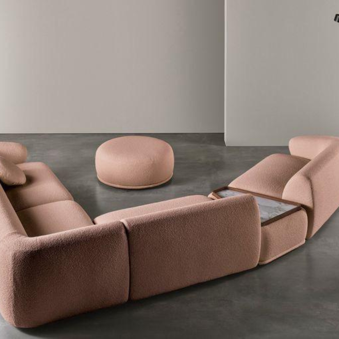 • Description : salon en bouclette courbé sur les cotés modulables Avec une table de séparation en verre noir