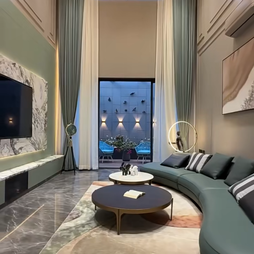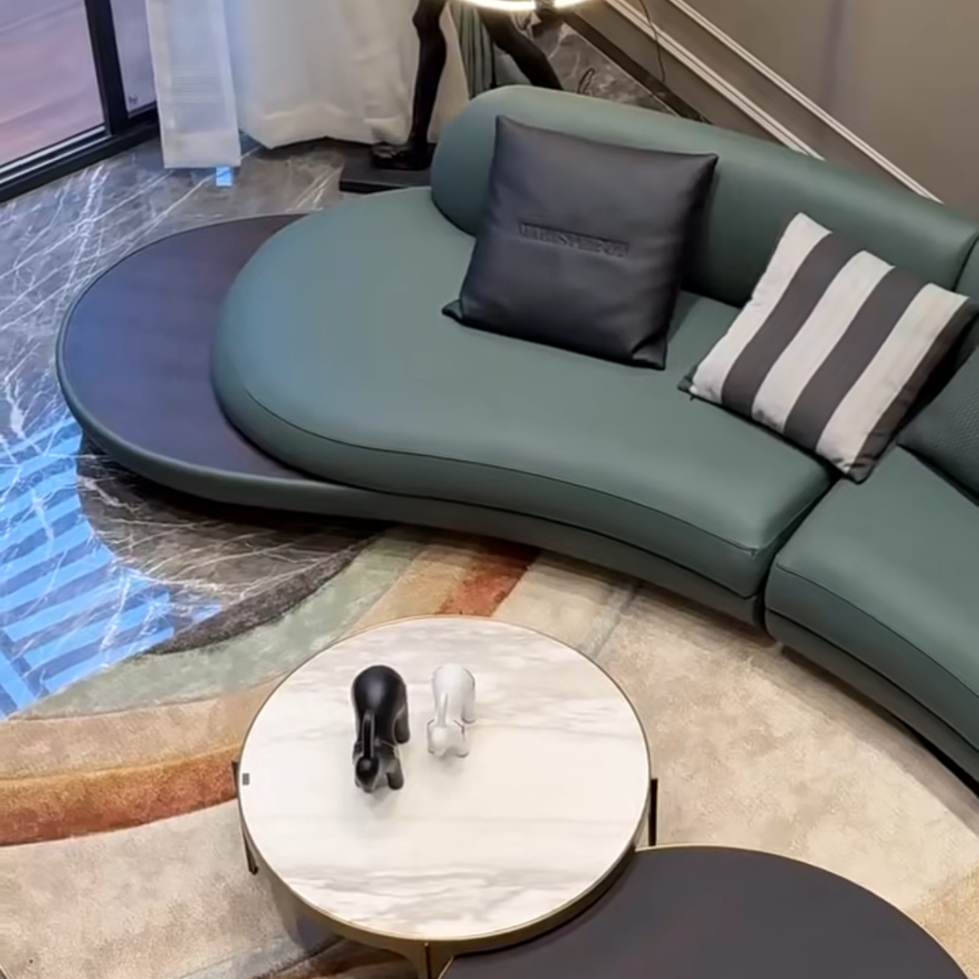 • Description : canapé D'angle vert socle en bois avec des pietement et une assise fine tissus cuir avec duo de table en métal et mabre