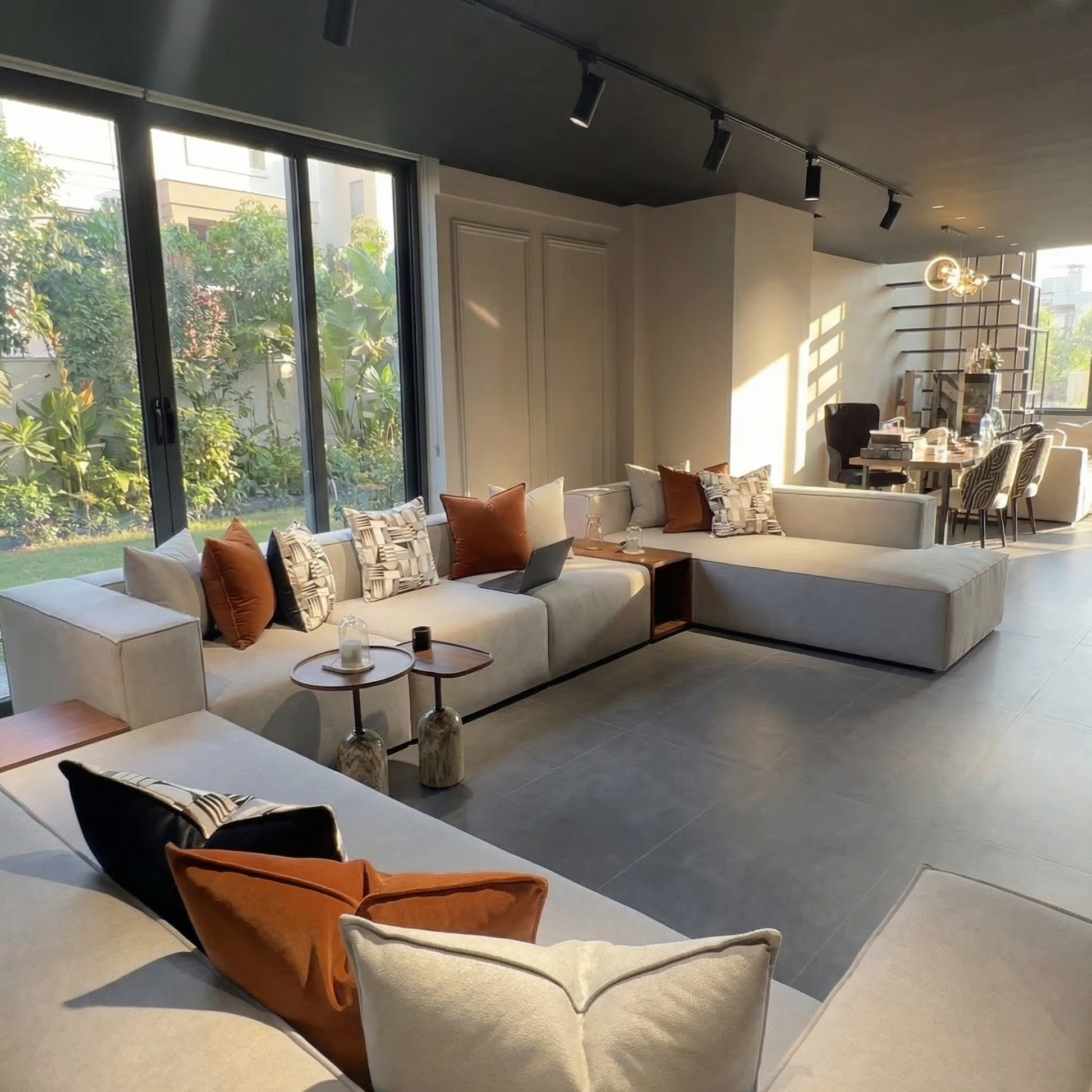 • Description : tissus en lin avec des tables de séparation en bois noyé et des coussins de décoration imprimés