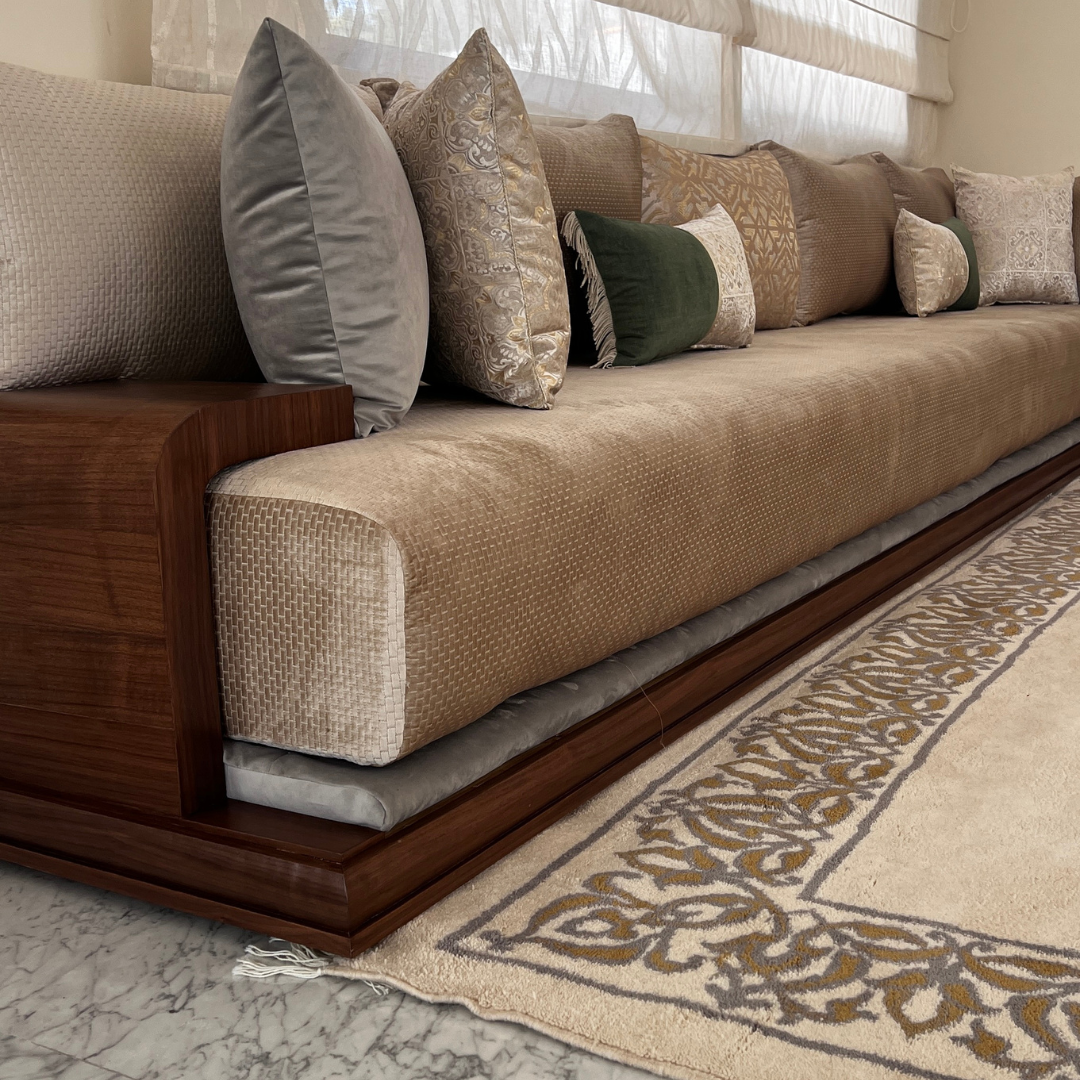 • Description : assise central entièrement brodé + des coussins brodés, bois noyé avec deux accoudoirs sous forme d'un L , velours piqué pour l'assise  + des coussins de décoration
